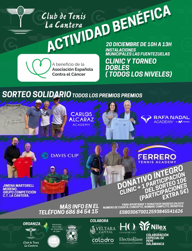 El deporte y la solidaridad se darán la mano el próximo 20 de diciembre en las Instalaciones Municipales de Las Fuentezuelas. El Club de Tenis La Cantera, en colaboración con la Escuela de Tenis Antonio Romero y el respaldo del Patronato Municipal de Deportes de Jaén, organiza un gran Torneo Benéfico de Tenis.